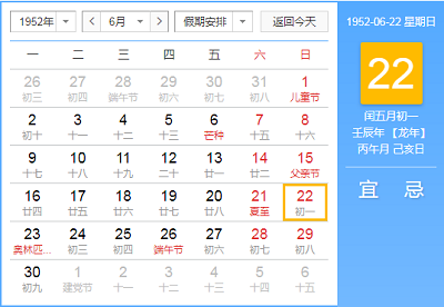 公历:公历1952年6月22日 星期日农历:农历一九五二年 闰五月 初一