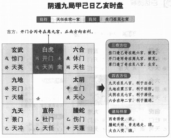 符使宫位:值符天任星在坎一宫,值使生门在兑七宫。时干遇凶星宿,时干逢吉。逢己日不宜用事。