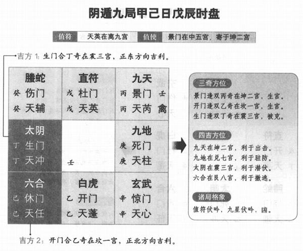 戊辰英九,景五避五。宿凶干吉。景丙坤义,开乙坎义,生丁展害。天二,地七,阴三,合八。生与星合三正东,时干离,开与日合一正北,符伏。