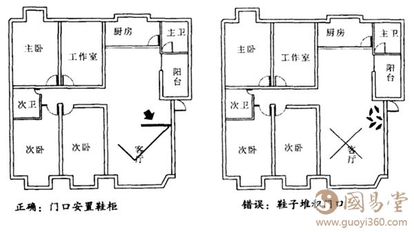 当然,最好在门口或玄关安置一个鞋柜以收纳鞋子,以免不良气息散发出来——乱糟糟地在门口摆放一地也不好看。甚至还可以把这个鞋柜当做屏风来用,阻挡由屋外侵入的煞气。应注意的是,鞋柜不可超过五层,这有契合五行以及脚踏实地之意,简单地来说,过高的鞋柜也不方便取放鞋子。