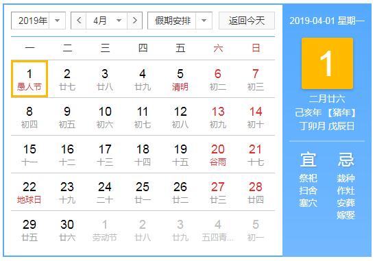 公历:2019年4月1日 星期一