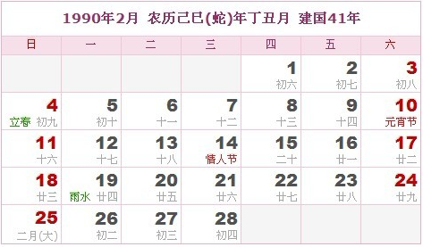 阳历1990年2月 农历己巳(生肖蛇)年丁丑月 建国41年