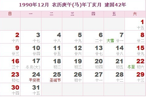 阳历1990年12月 农历庚午(生肖马)年丁亥月 建国42年