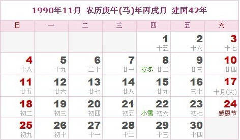 阳历1990年11月 农历庚午(生肖马)年丙戌月 建国42年