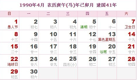 阳历1990年4月 农历庚午(生肖马)年己卯月 建国41年