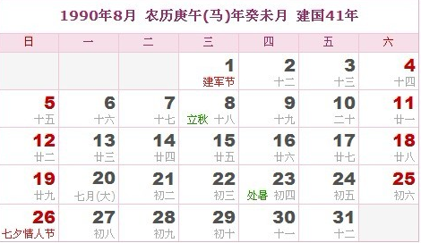 阳历1990年8月 农历庚午(生肖马)年癸未月 建国41年