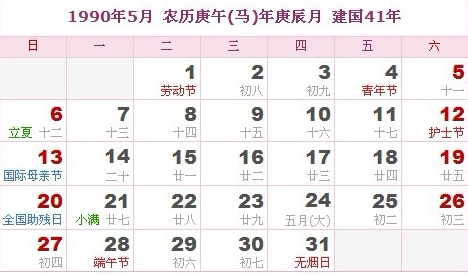 阳历1990年5月 农历庚午(生肖马)年庚辰月 建国41年