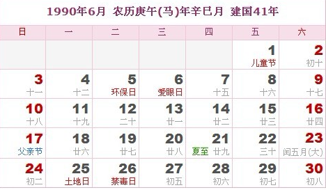阳历1990年6月 农历庚午(生肖马)年辛巳月 建国41年