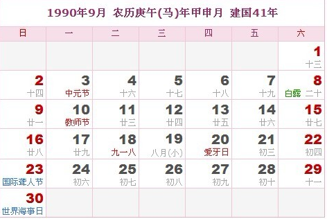 阳历1990年9月 农历庚午(生肖马)年甲申月 建国41年