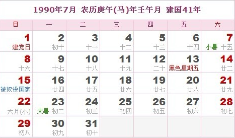 阳历1990年7月 农历庚午(生肖马)年壬午月 建国41年