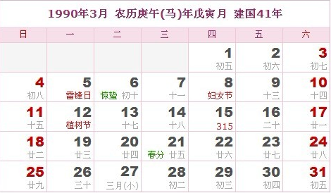 阳历1990年3月 农历庚午(生肖马)年戊寅月 建国41年