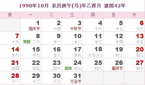 阳历1990年10月 农历庚午(生肖马)年乙酉月 建国42年