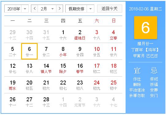公历:2018年2月6日 星期二