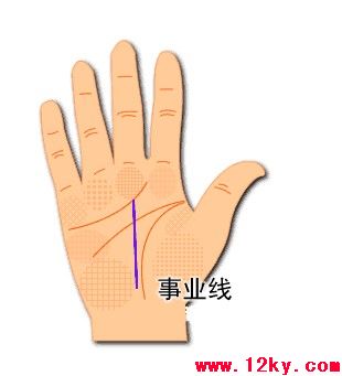 通常我们最常见的事业线是从掌底到达中指末端的一条深长的线。若是这条线没有任何杂纹。中断的情况下。说明此人的事业运势非常顺利,事业平稳。若是事业线到感情线停止,则代表不佳。古代相学中是这样说道的,若是事业线到感情线停止的话,那麽此人的事业会因感情问题而导致失败,也就是说某人会因为感情问题而忽视事业,从而导致事业失败。