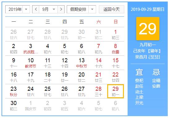 2019年9月29日黄历查询,2019年9月29日公历农历查询