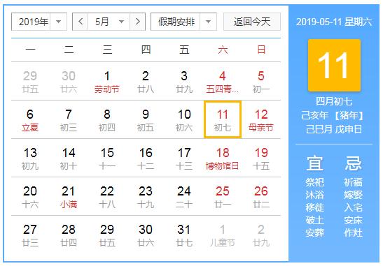 2019年5月11日黄历查询,2019年5月11日公历农历查询