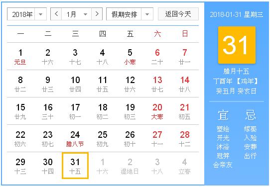 公历:2018年1月31日 星期三