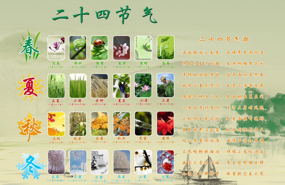 古代流传一首歌诀说:正月立春雨水节,二月惊蛰及春分,三月清 明并榖雨,四月立夏小满方,五月芒种并夏至,六月小暑大暑当,七月立秋还处暑,八月白露秋分忙,九月寒露并霜降,十月立冬小雪涨,子月大雪并冬至,腊月小 寒大寒昌。当然这些节气是以大陆黄河流域的气候为准命名的,现今只要参考阳历的日期,仍能解梦佬掌握这些节气变化的。