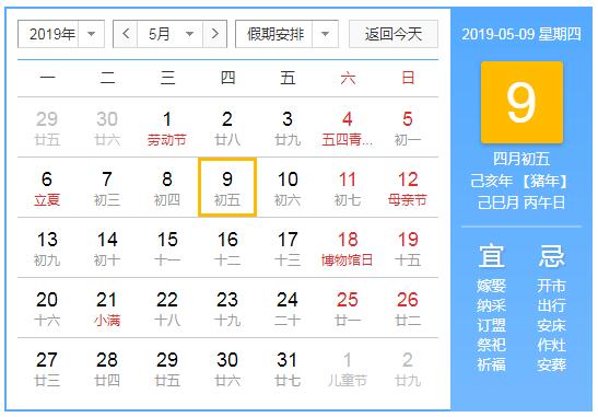 2019年5月9日黄历查询,2019年5月9日公历农历查询