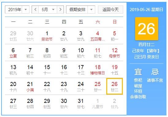 2019年5月26日黄历查询,2019年5月26日公历农历查询