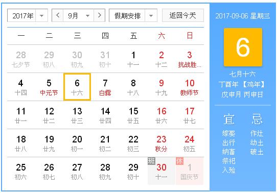 公历:2017年9月6日 星期三