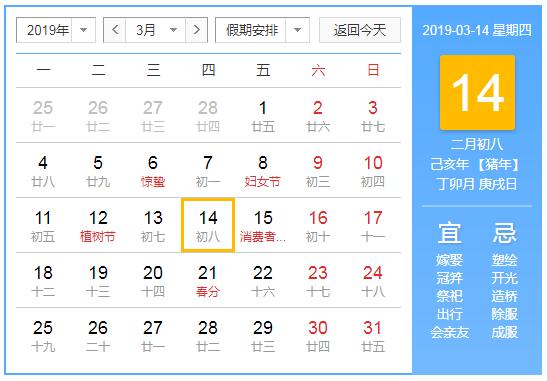 2019年3月14日黄历查询,2019年3月14日公历农历查询
